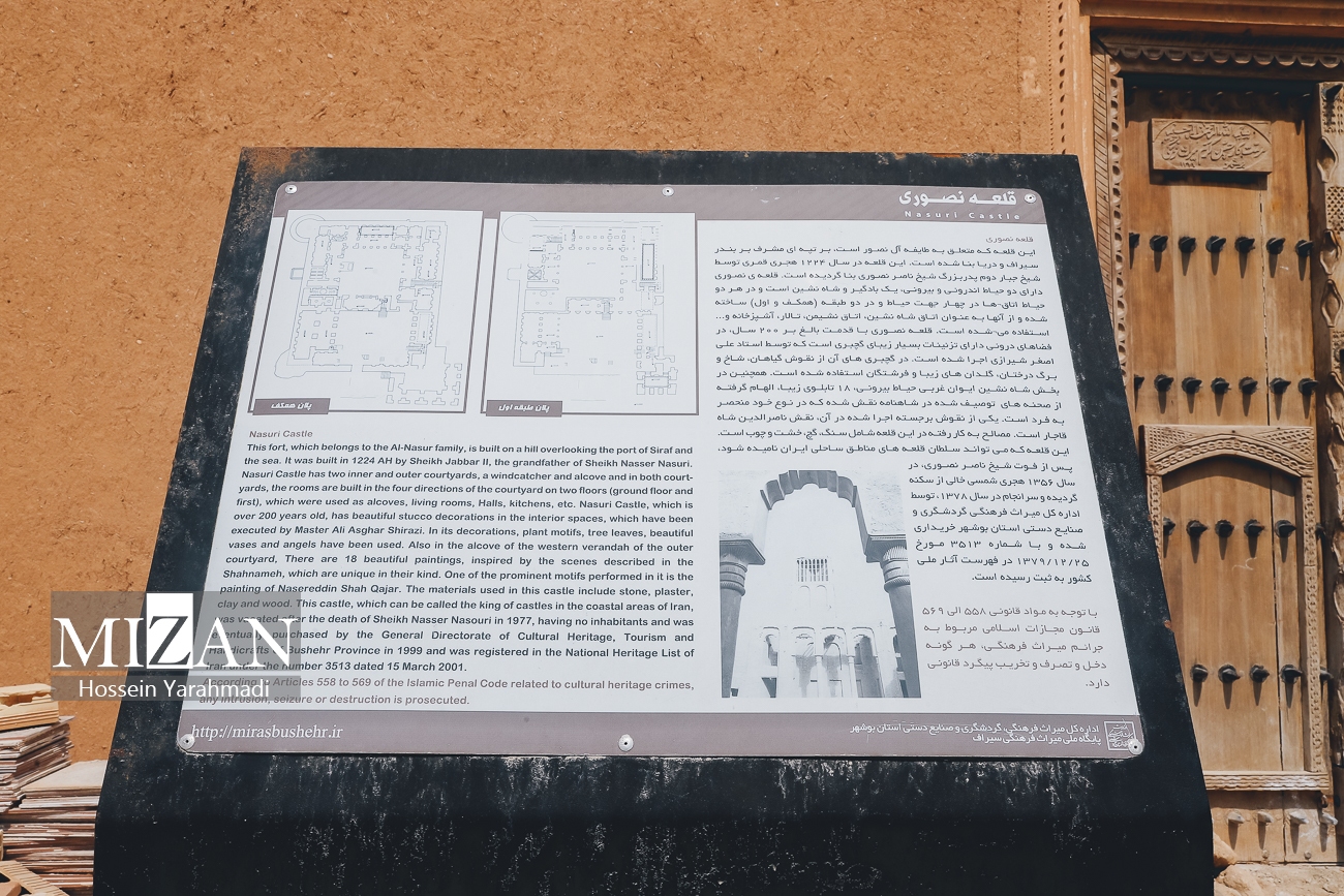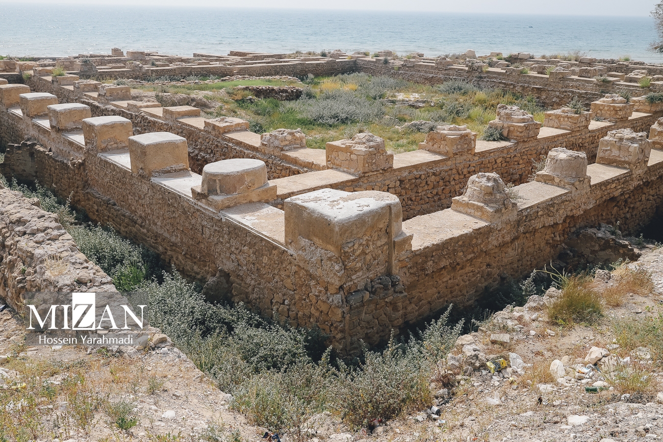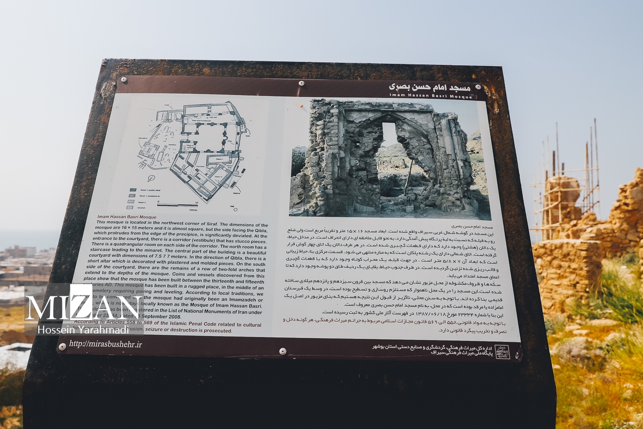 سیراف یکی از قدیمیترین و پررونقترین بندرهای کشور در دوره ساسانی بوده و روابط تجاری زیادی با روم و یونان در اروپا و ماداگاسکار در آفریقا تا کانتون چین در آسیا داشت. این بندر مابین بندر کنگان و بندر عسلویه واقع شدهاست و دارای معماری خاصی است. این بندر بین دریا و کوه قرار گرفته و تنها دارای یک خیابان است. در بعضی جاها فاصله کوه تا دریا به ۳۰ متر هم نمیرسد به همین دلیل برخی خانههای مردم روی کوه بنا شدهاست. از آثار تاریخی آن میشود به قلعه نصوری و آثار باستانی بنای مسجد جامع (که بر روی پی یک عمارت ساسانی ساخته شده)، مسجد امام حسن بصری، عمارت شیخ جبار نصوری، و گور دخمهها و سیستم آبرسانی دوره ساسانی اشاره کرد. سفالهای بازمانده با نقشهای گوناگون، پارچهها و زیورآلات، معماریهای گچی و اتاقهای آذین شده به آثار هنری و ساختمانهای دو سه طبقه بخشی از میراث بجا مانده از آن تمدن است. اما زمین لرزه مرگبار هفت روزه سال سیصد و شصت و هفت هجری قمری مدفون شدن کامل این بندر را در پی داشت.