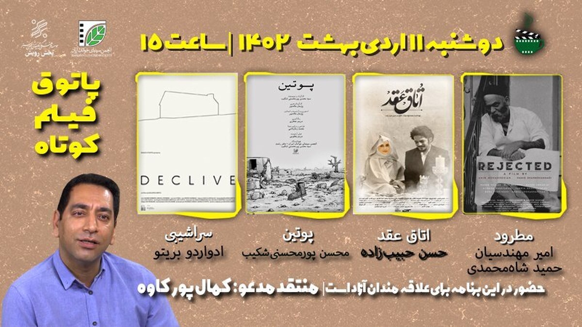فیلم‌های کوتاه «مطرود»، «سراشیبی»، «اتاق عقد» و «پوتین» در ششمین جلسه از فصل هشتم پاتوق فیلم کوتاه، با حضور کمال پورکاوه اکران، تحلیل و نقد می‌شوند.