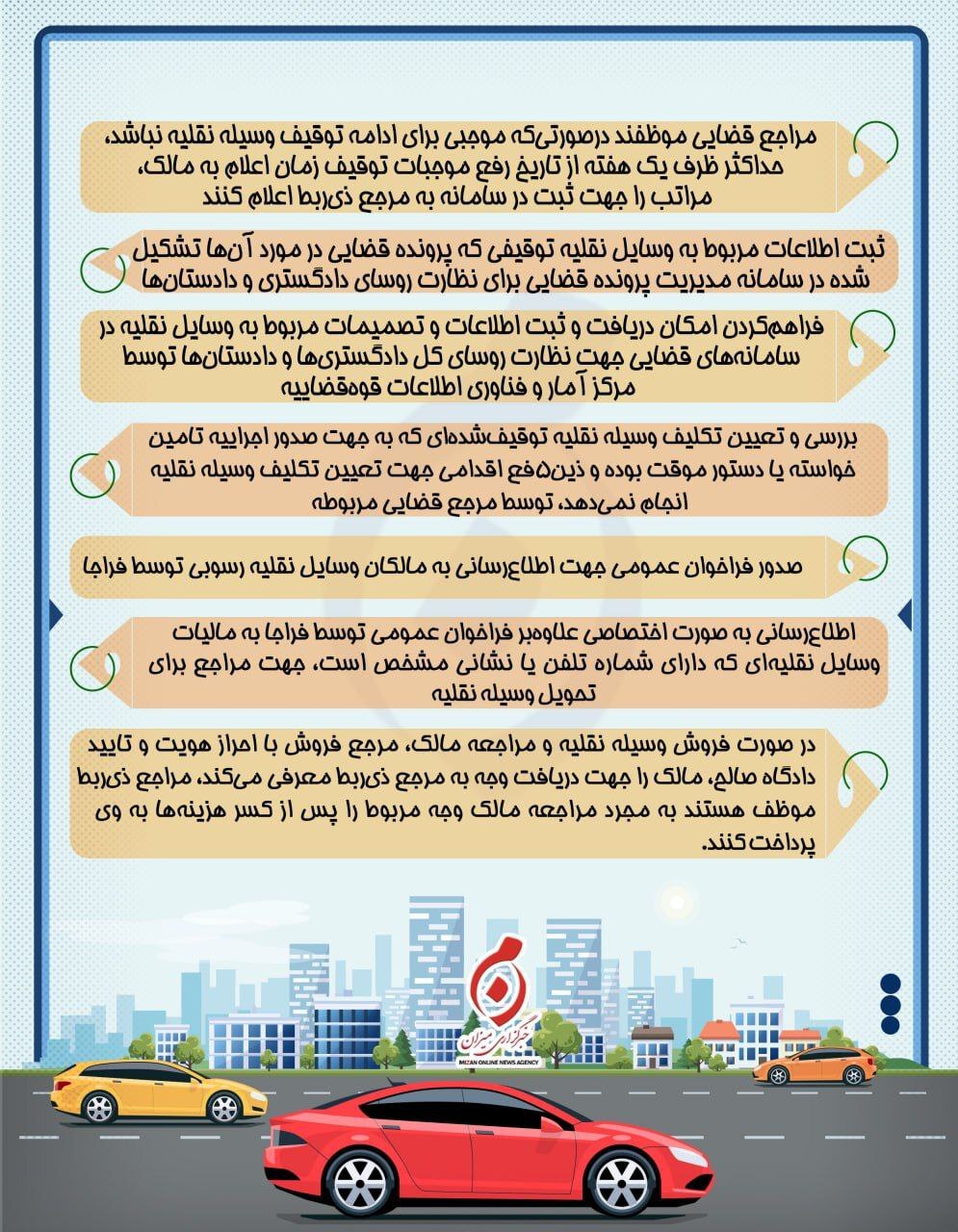 اینفوگرافیک | دستورالعمل ساماندهی فرآیند توقیف، انتقال، نگهداری و ترخیص وسایل نقلیه