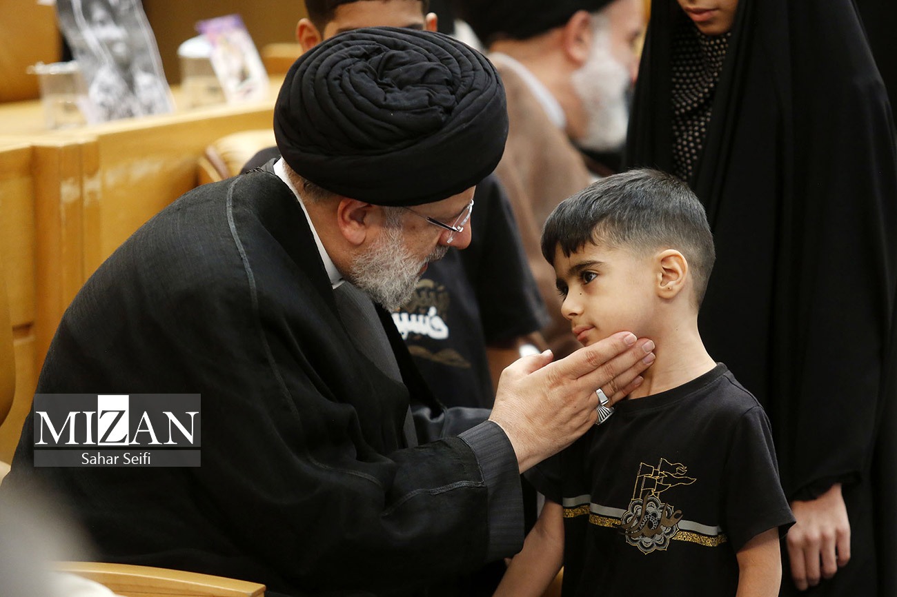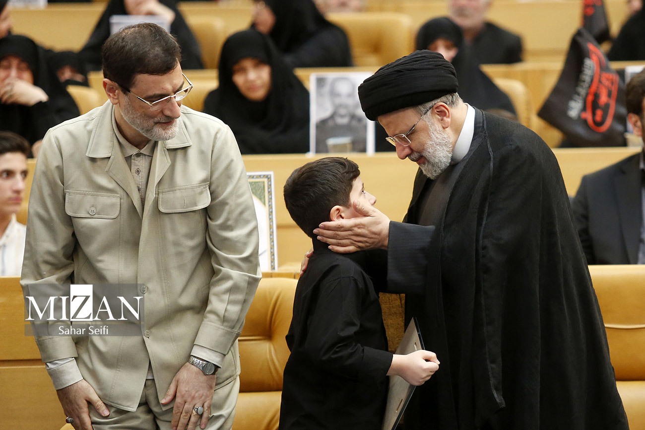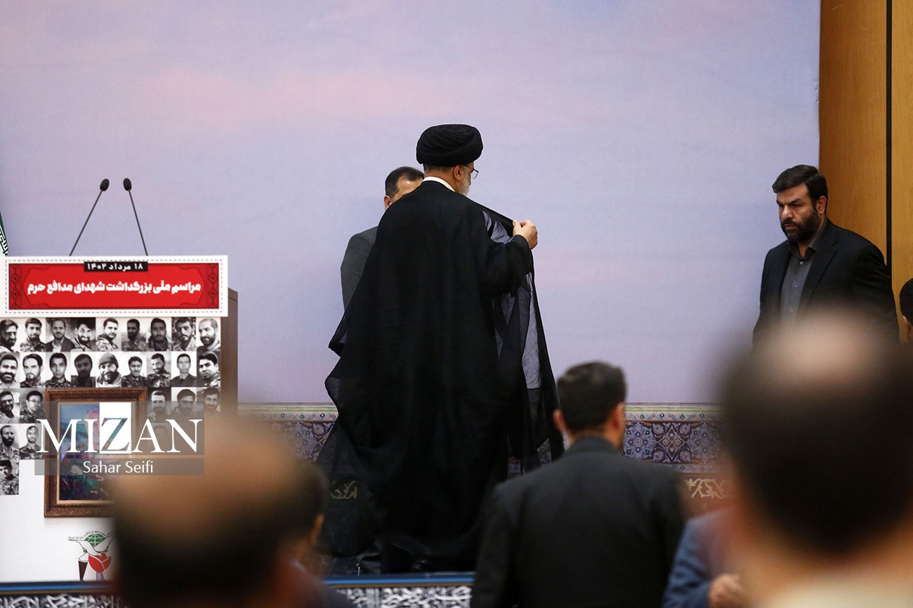 مراسم بزرگداشت شهدای مدافع حرم صبح چهارشنبه (۱۸ مرداد ۱۴۰۲) با حضور آیت الله رئیسی، رئیس جمهور و جمعی از خانواده شهدا در سالن اجلاس سران برگزار شد.