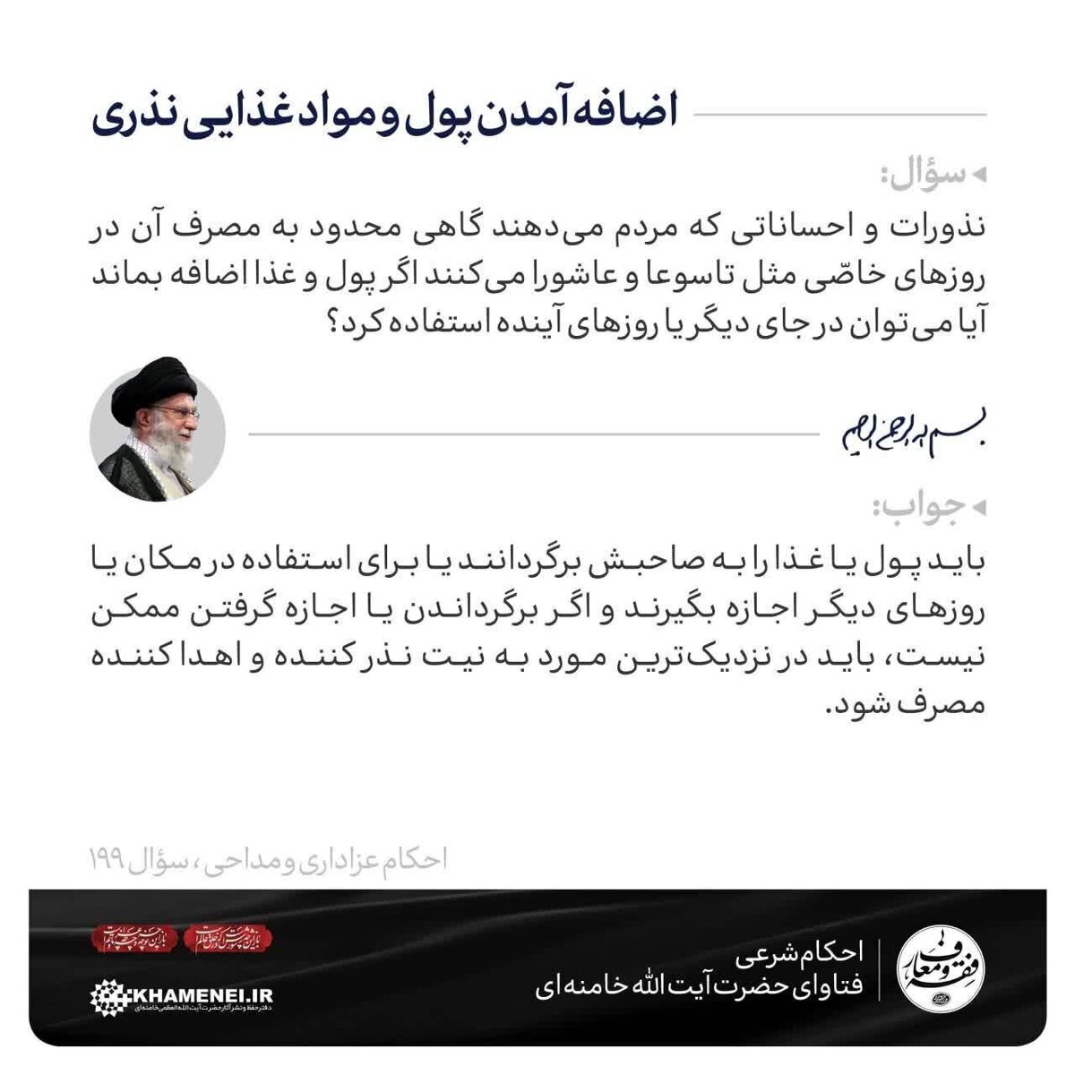 پایگاه Khamenei.ir به پاسخ رهبر معظم انقلاب اسلامی به پرسشی درباره اضافه آمدن پول و مواد غذایی نذری پرداخته است.
