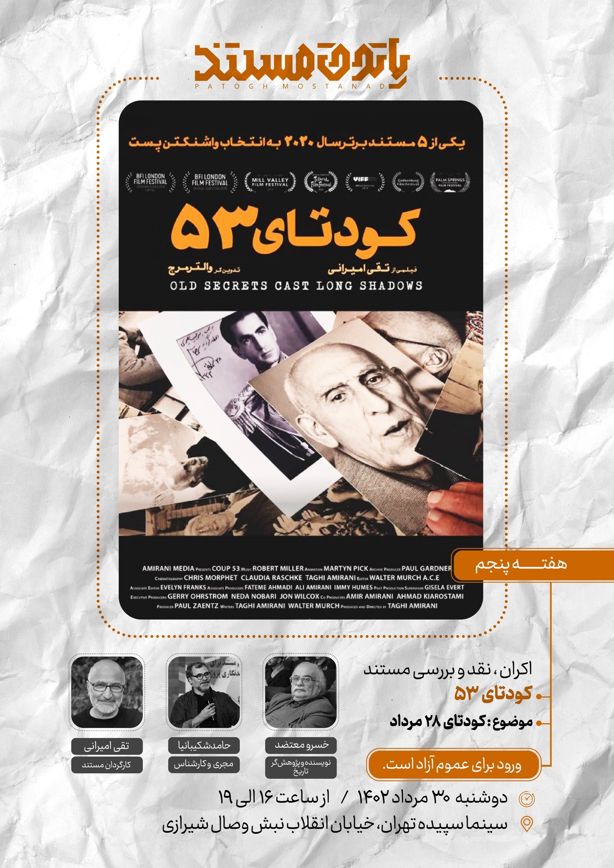 خبرگزاری میزان- به گزارش روابط عمومی «پاتوق مستند سوره»، همزمان با هفتادمین سالگرد کودتای ۲۸ مرداد، هفته پنجم «پاتوق مستند سوره» به نمایش و نقد و بررسی مستند «کودتای ۵۳» به کارگردانی تقی امیرانی اختصاص پیدا کرده است.