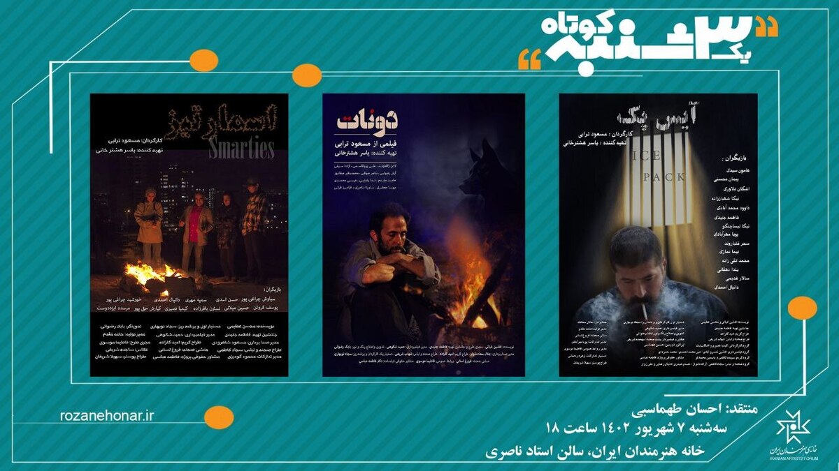 خبرگزاری میزان- به گزارش روابط عمومی برنامه، سه فیلم کوتاه «آیس پک»، «دونات» و «اسمارتیز» به تهیهکنندگی یاسر هشترخانی و کارگردانی مسعود ترابی عصر روز سهشنبه هفتم شهریور ۱۴۰۲ ساعت ۱۸ در سالن استاد ناصری خانه هنرمندان ایران نمایش داده میشود.