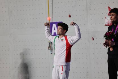 فیلم اهدای مدال طلای رضا علیپور و اهتزاز پرچم ایران در محل برگزاری مسابقات سنگنوردی