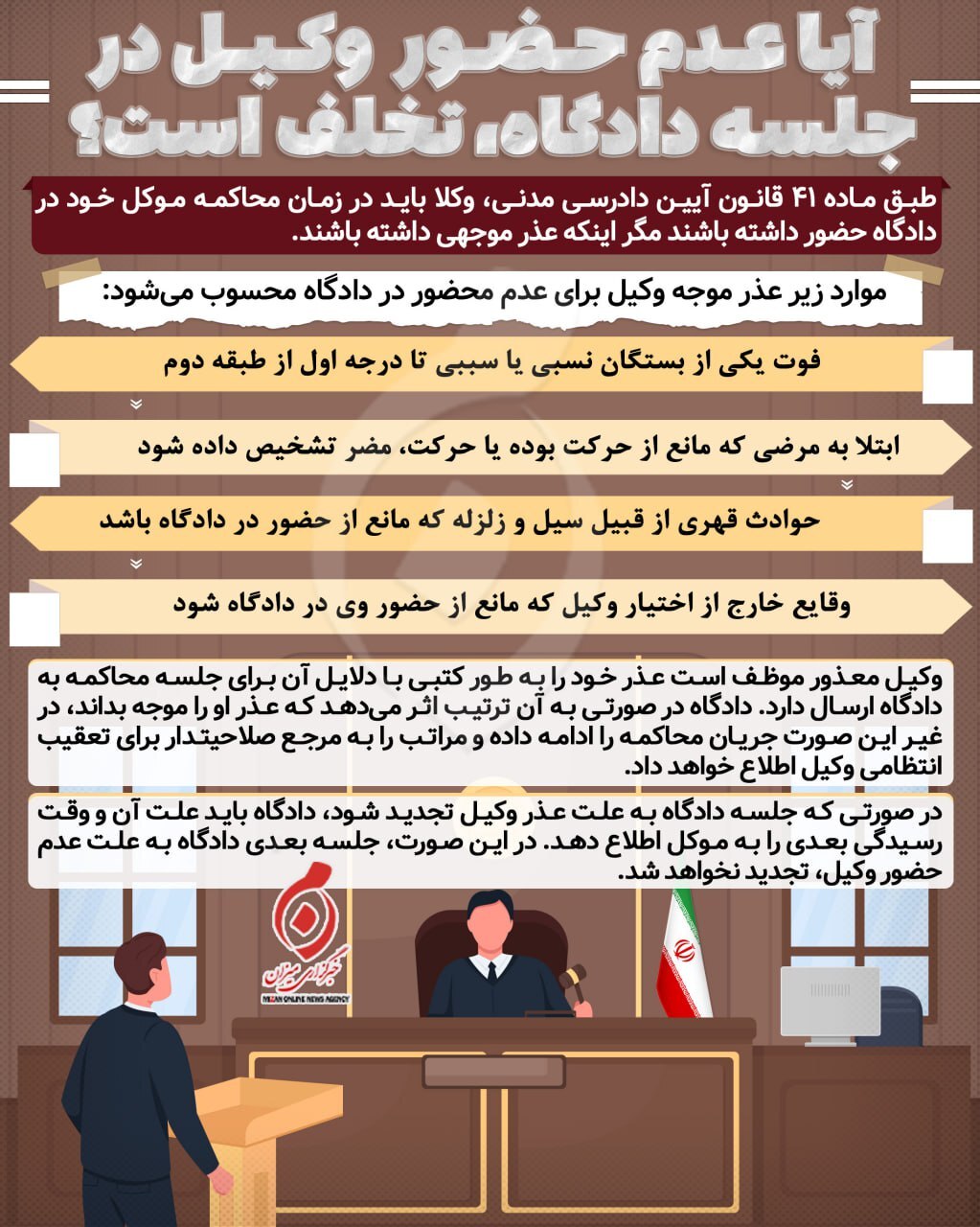 اینفوگرافیک | آیا عدم حضور وکیل در جلسه دادگاه، تخلف است؟