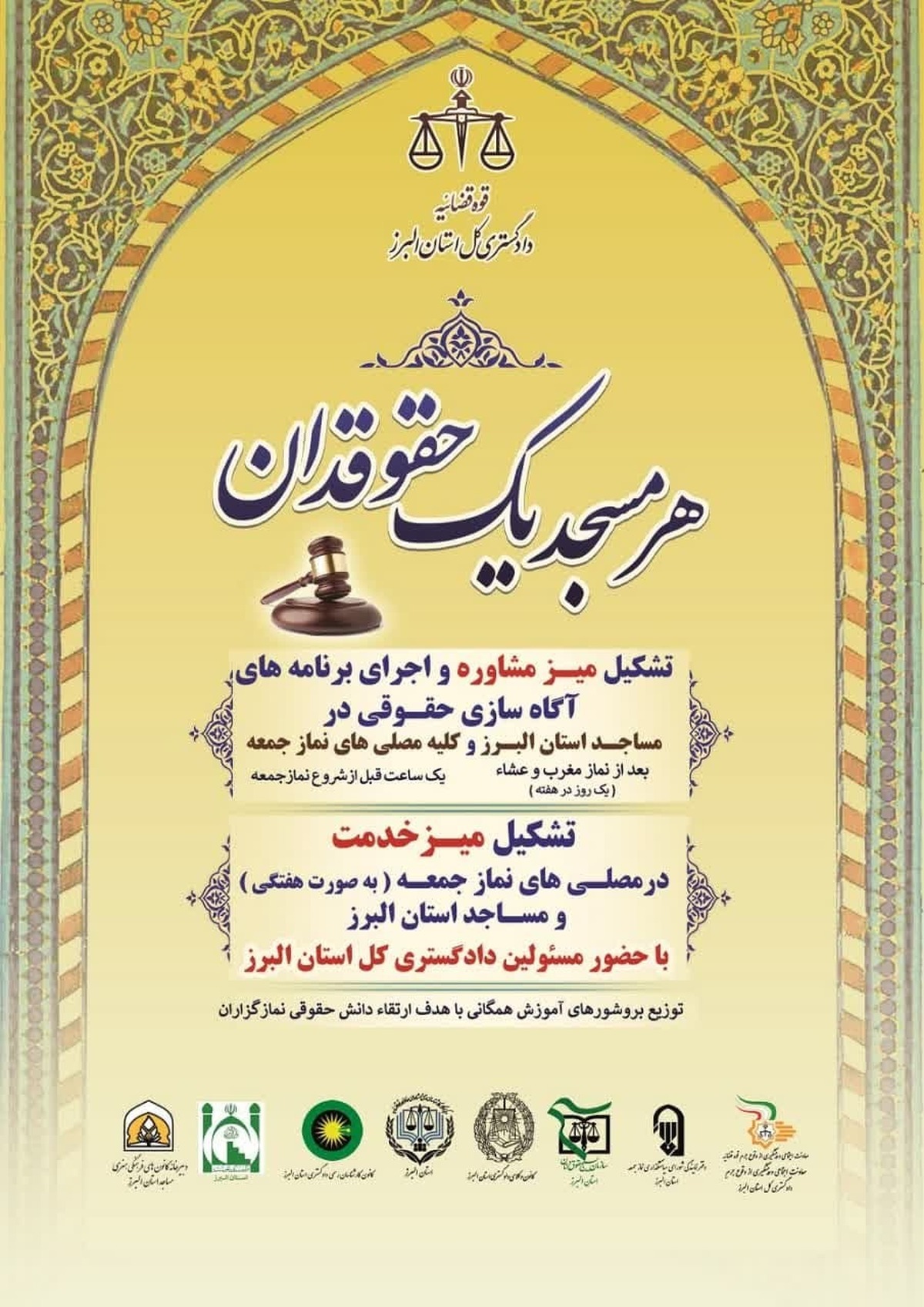 وی در ادامه با تبیین اقدامات انجام شده در راستای اجرای طرح هر مسجد یک حقوقدان بیان کرد: در این مورد سند ائتلاف ما بین این معاونت و مرکز وکلای قوه قضاییه استان، کانون وکلای دادگستری استان، مرکز کارشناسان رسمی دادگستری استان، کانون کارشناسان رسمی دادگستری دادگستری استان، مرکز رسیدگی به امور مساجد استان، کانون فرهنگی هنری مساجد استان، دفتر نمایندگی شورای سیاستگذاری ائمه جمعه استان و سازمان بسیج حقوقدانان استان البرز منعقد شده و منجر به ارائه شده است.