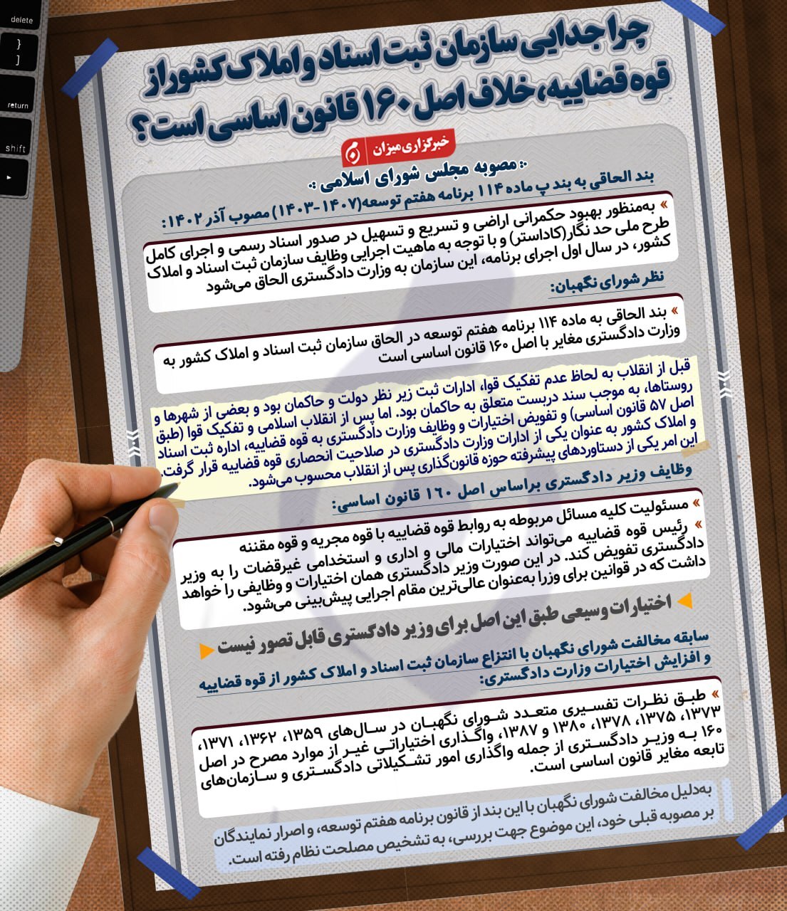 اینفوگرافیک | چرا جدایی سازمان ثبت اسناد و املاک کشور از قوه قضاییه، خلاف اصل ۱۶۰ قانون اساسی است؟