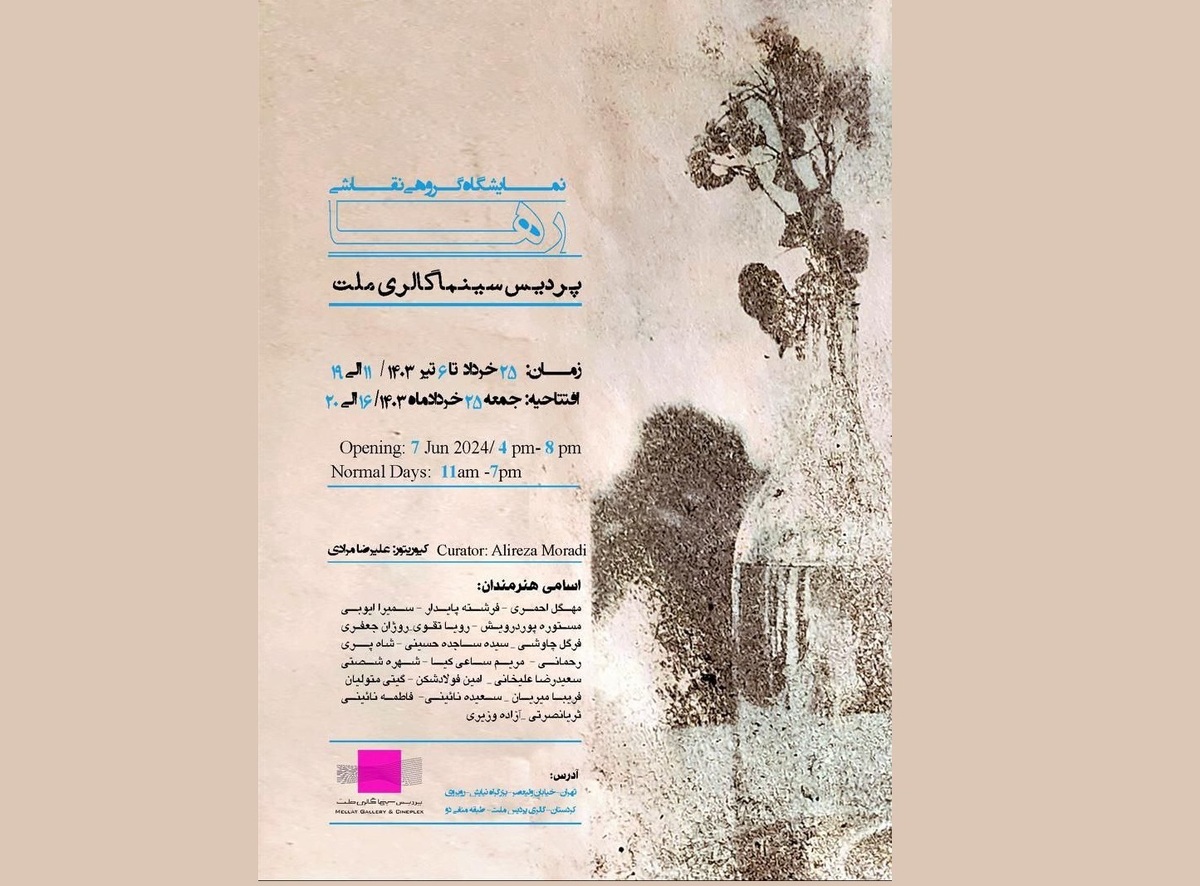 نمایشگاه «رها» روز جمعه بیست و پنجم خردادماه ۱۴۰۳ از ساعت ۱۶ الی ۲۰ در گالری پردیس ملت افتتاح میشود و تا ۶ تیرماه ادامه دارد.