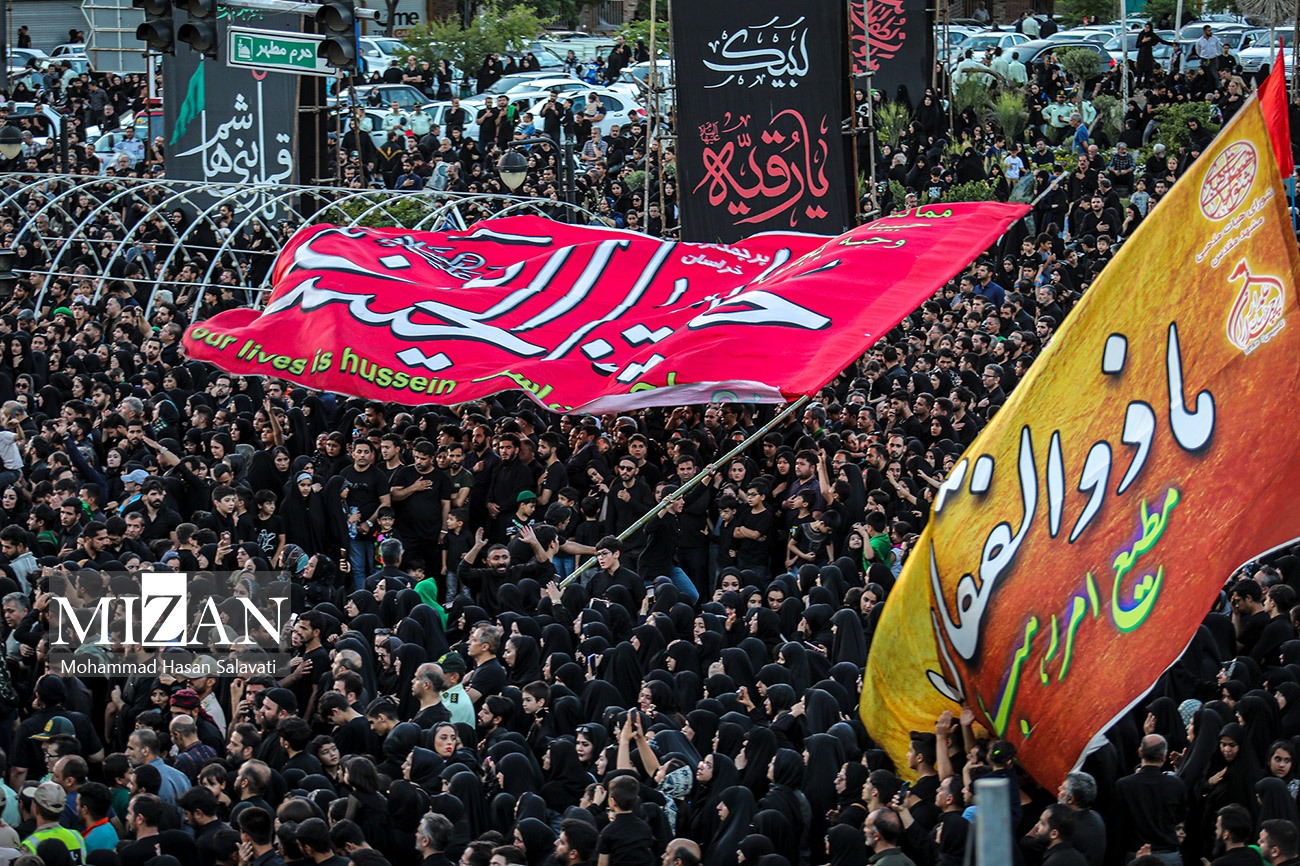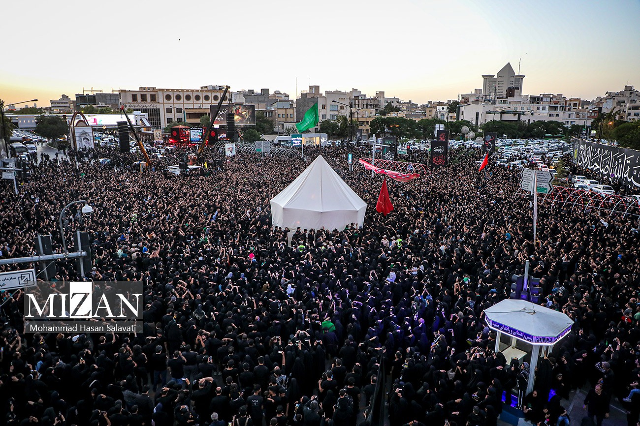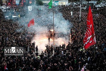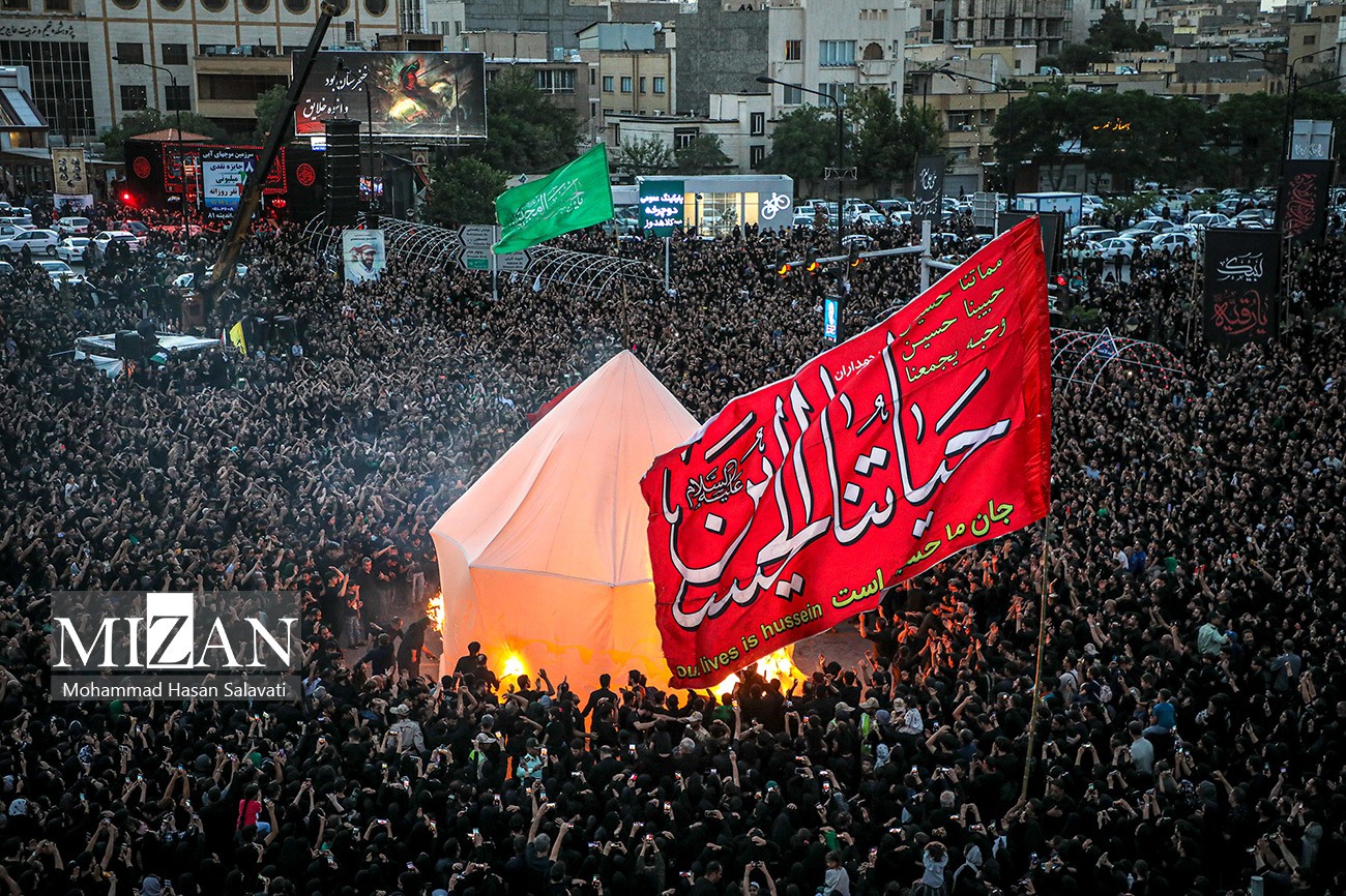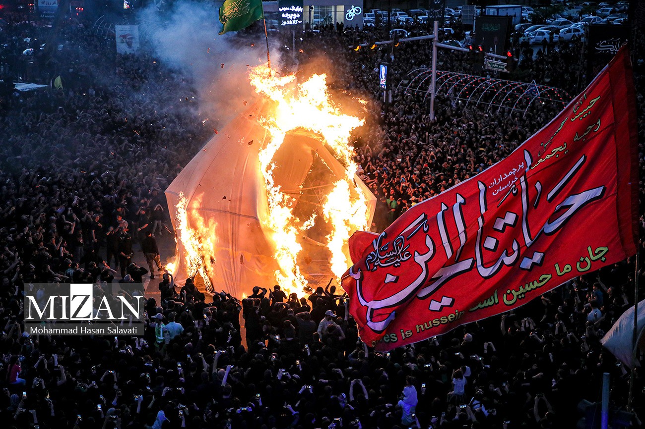 همزمان با فرارسیدن عصر عاشورا ، آیین خیمه سوزان با حضور پرشور عزاداران سید و سالار شهیدان در خیابان احمد آباد مشهد برگزار شد.