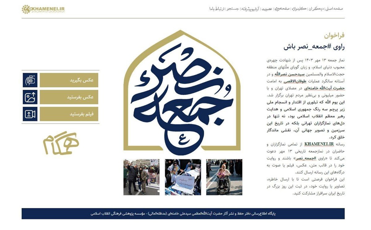 رسانه KHAMENEI.IR از تمامی نمازگزاران و حاضران در نمازجمعه تاریخی ۱۳ مهر دعوت کرده است تا «راوی جمعه نصر» باشند.
