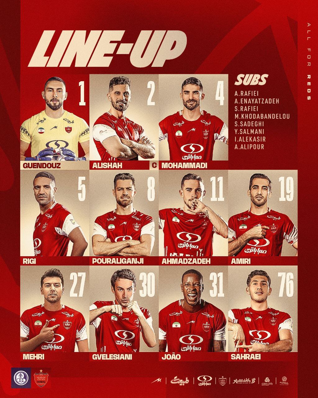 الکسیس گندوز، گئورگی گولسیانی، میلاد محمدی، مسعود ریگی، مرتضی پورعلیگنجی، سهیل صحرایی، فرشاد احمدزاده، وحید امیری، سعید مهری، امید عالیشاه و لوکاس ژوائو