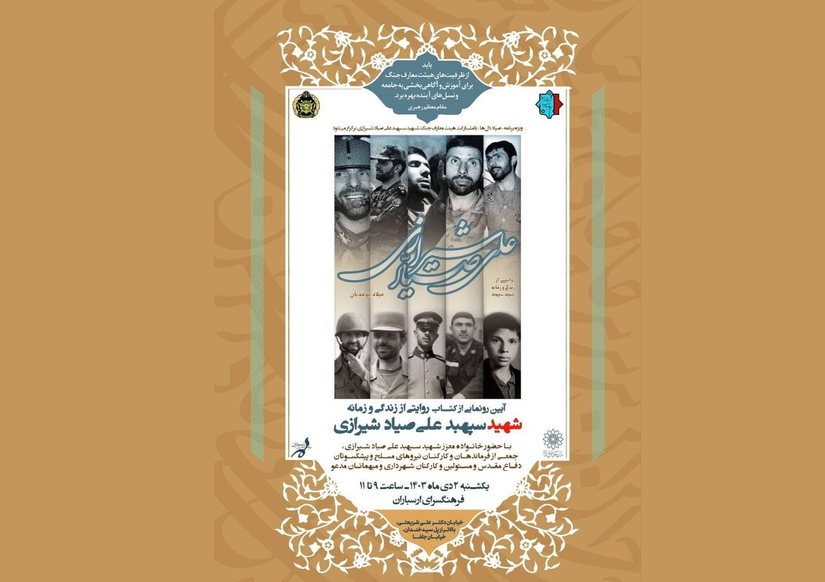 به گزارش روابط عمومی فرهنگسرای ارسباران، آیین رونمایی از کتاب روایتـی از زندگی و زمانه شهیـد «علی صیاد شیـرازی» تالیف میلاد موحدیان با حضور خانواده معزز شهیـد صیـاد شیـرازی و جمعی از امیران، فرماندهان نیروی زمینی، هوایی، پدافند و دریایی ارتش و پیشکسوتان دفاع مقدس، روز یکشنبه دوم دی ماه ساعت ۹ با مشارکت هیئت معارف جنگ شهید سپهبد علی صیاد شیرازی در فرهنگسرای ارسباران برگزار میشود.