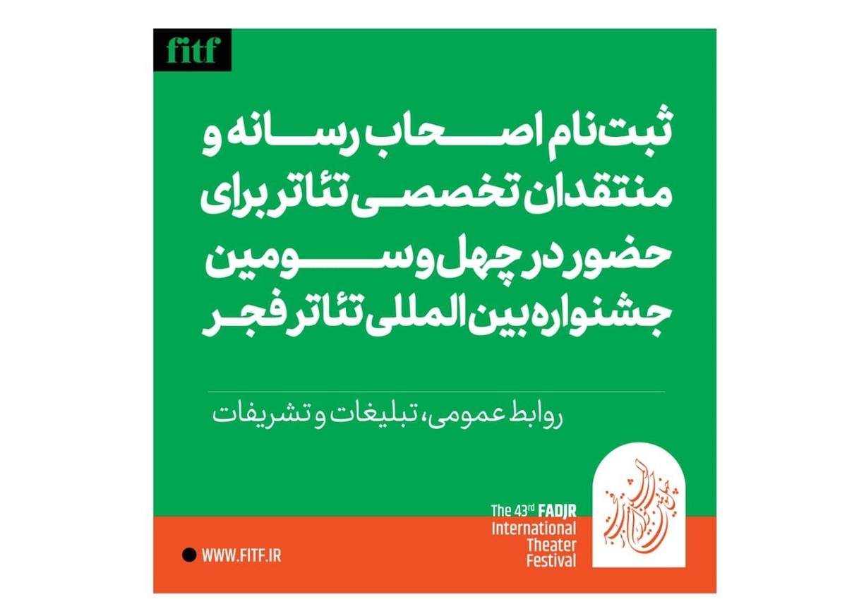 به گزارش روابط عمومی چهل و سومین جشنواره بینالمللی تئاتر فجر، ثبت نام اصحاب رسانه و منتقدان تخصصی تئاتر از ساعت ۸ صبح دوشنبه سوم دی در سامانه اطلاعرسانی جشنواره به نشانی fitf.theater.ir آغاز و تا پایان شنبه ۸ دی ۱۴۰۳ ادامه خواهد داشت.