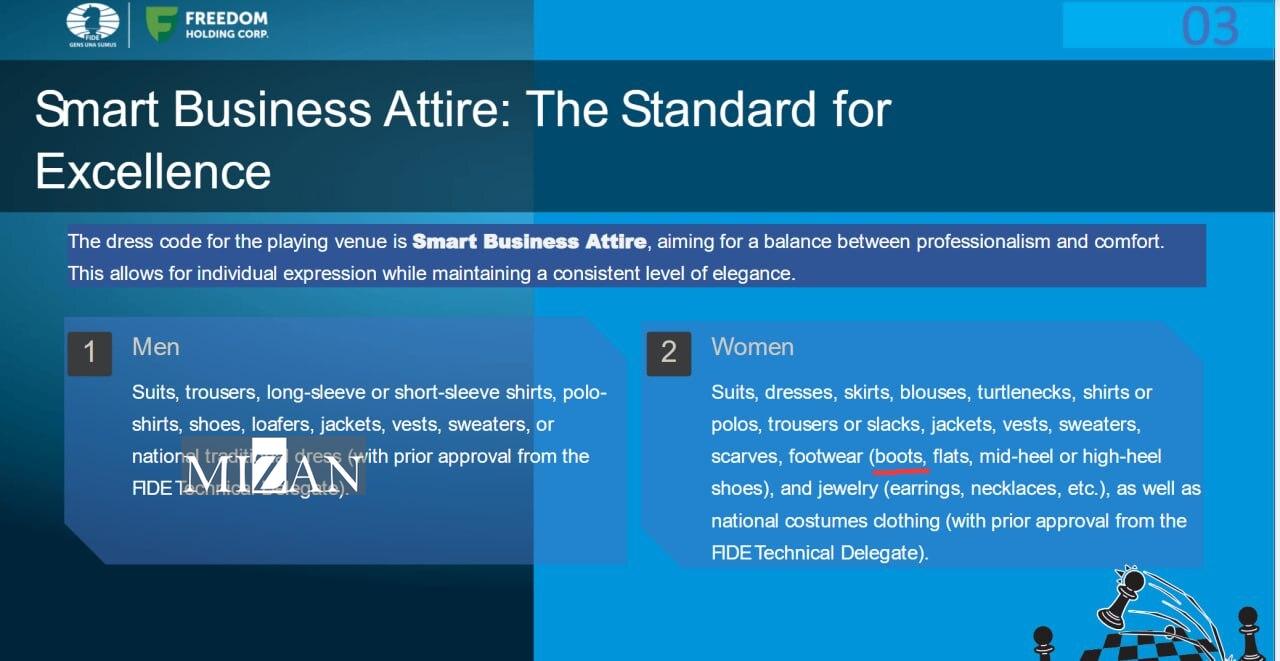 چندی پیش اخراج مگنوس کارلسن از سالن مسابقات به دلیل رعایت نکردن دستورالعمل فیده برای پوشش، جهان شطرنج را حیرتزده کرد و فیده برای دفاعیه از خود حتی بیانیهای هم صادر کرد و در نهایت مقابل مرد شماره یک جهان کوتاه آمد و این شطرنجباز مجددا با شلوار جین در مسابقات ظاهر شد.