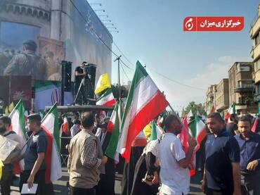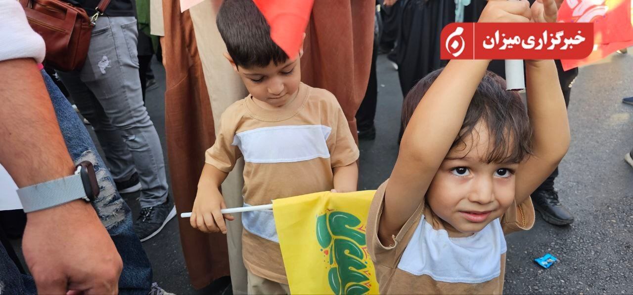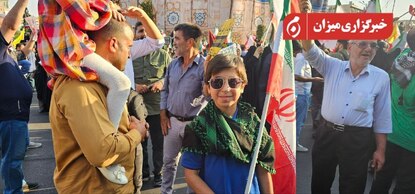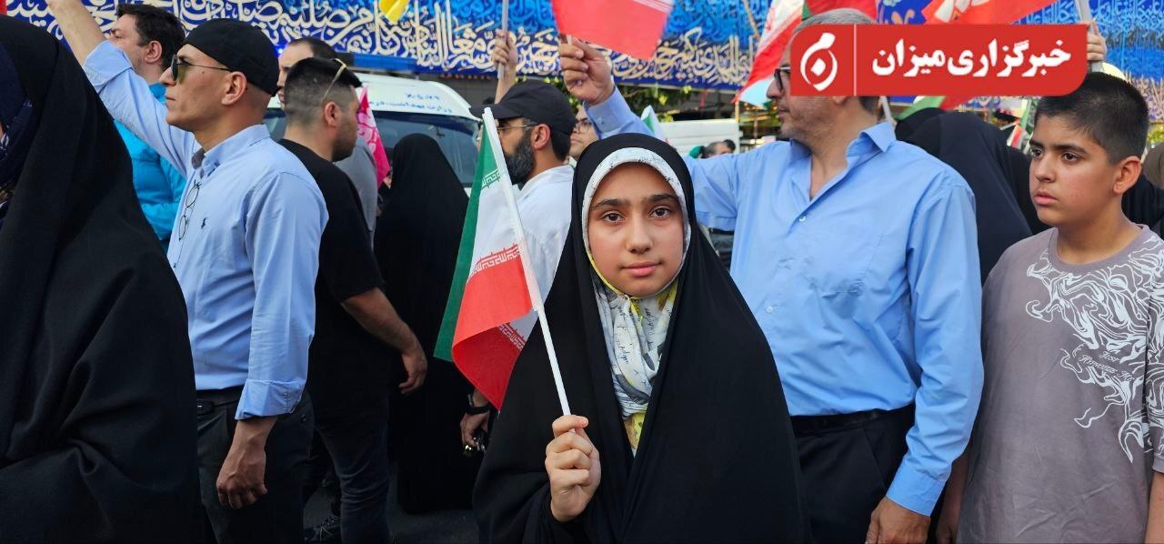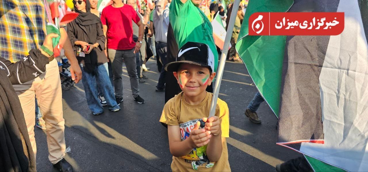 مادربزرگی که با نوهاش در اجتماع ایران حضور پیدا کرده و آرزویش سرکوبی رژیم تجاوزگر صهیونیستی است