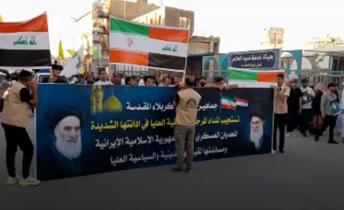 راهپیمایی مردم کربلا در حمایت از ایران و حضرت آیت الله خامنهای ساعتی قبل در باب قبله اباعبدالله (ع)