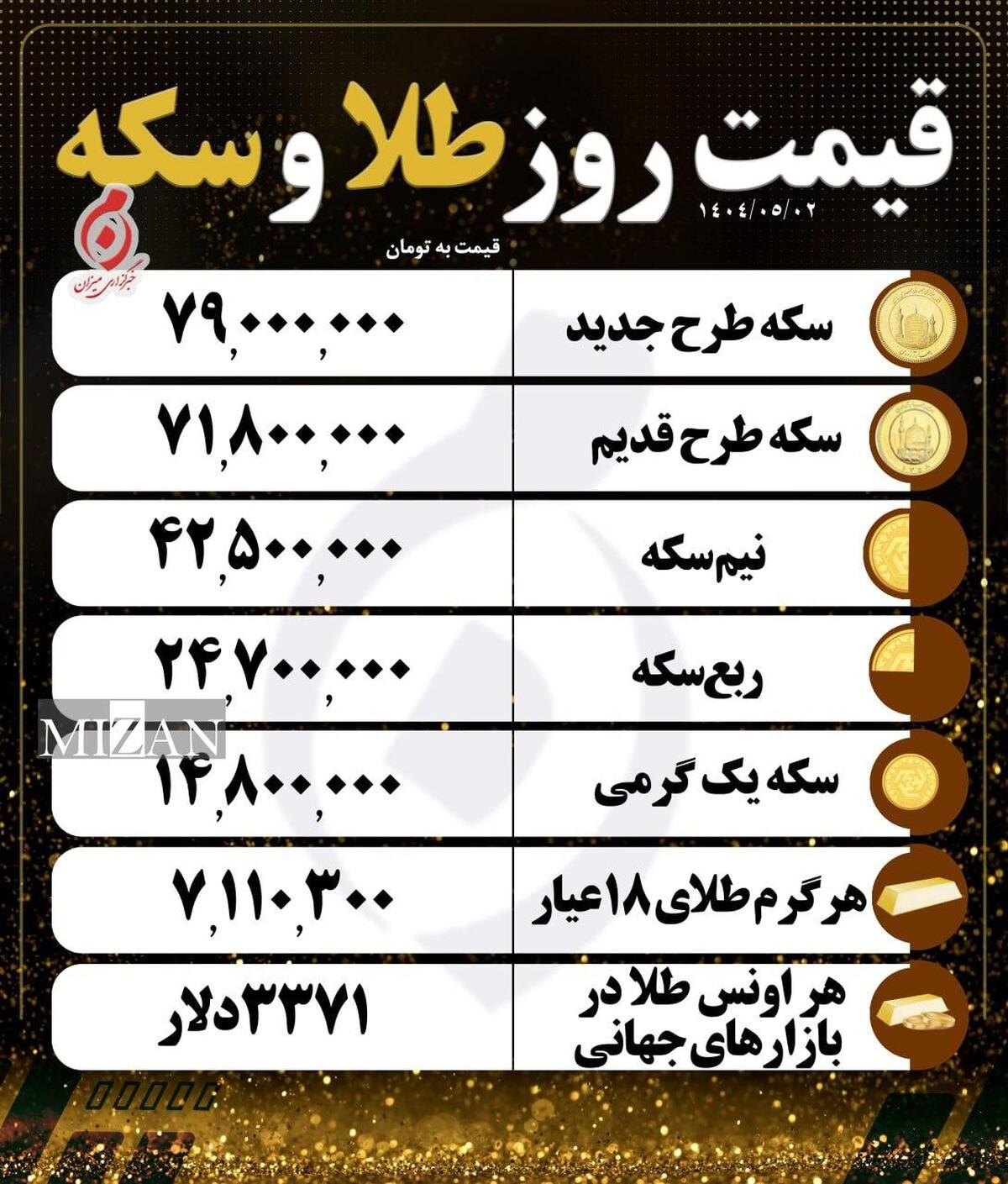 قیمت هر قطعه سکه طرح جدید امروز «۲ مرداد ۱۴۰۴» ۷۹ میلیون تومان اعلام شد و سکه طرح قدیم به ۷۱ میلیون و ۸۰۰ هزار تومان رسید.