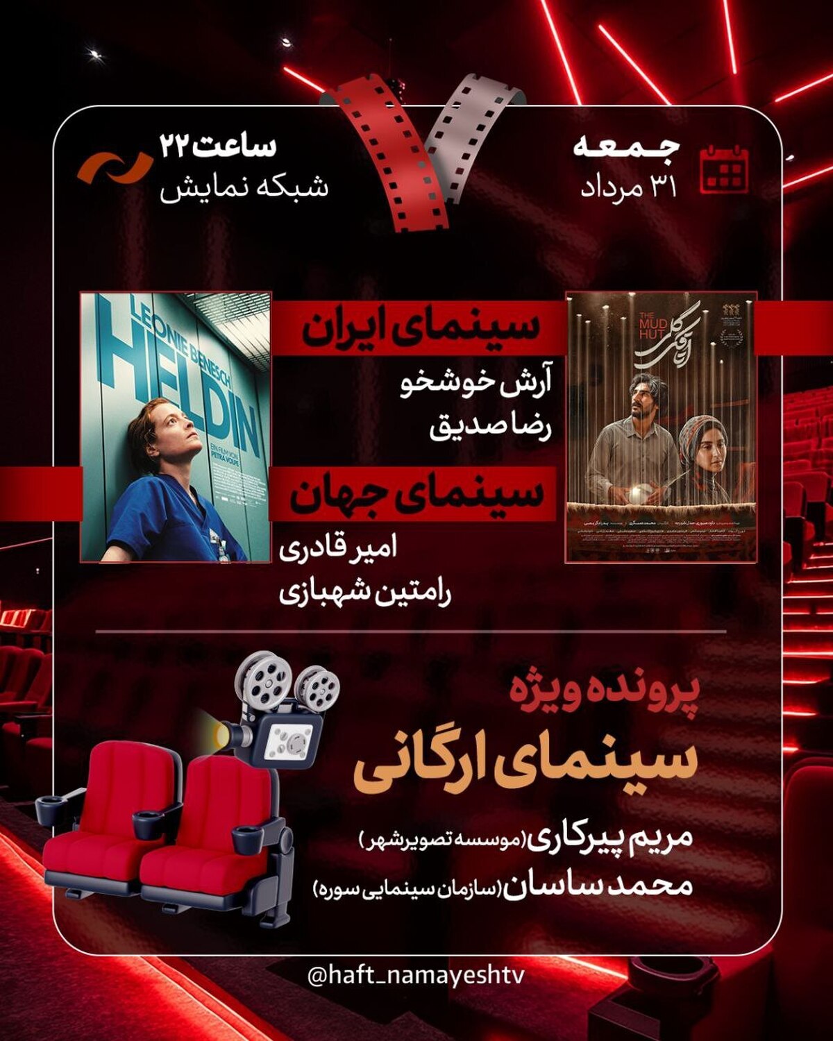 به گزارش روابط عمومی برنامه، جدیدترین قسمت از برنامه سینمایی «هفت»، امشب جمعه ۳۱ مرداد از ساعت ۲۲ به صورت زنده به آنتن شبکه نمایش میرود.