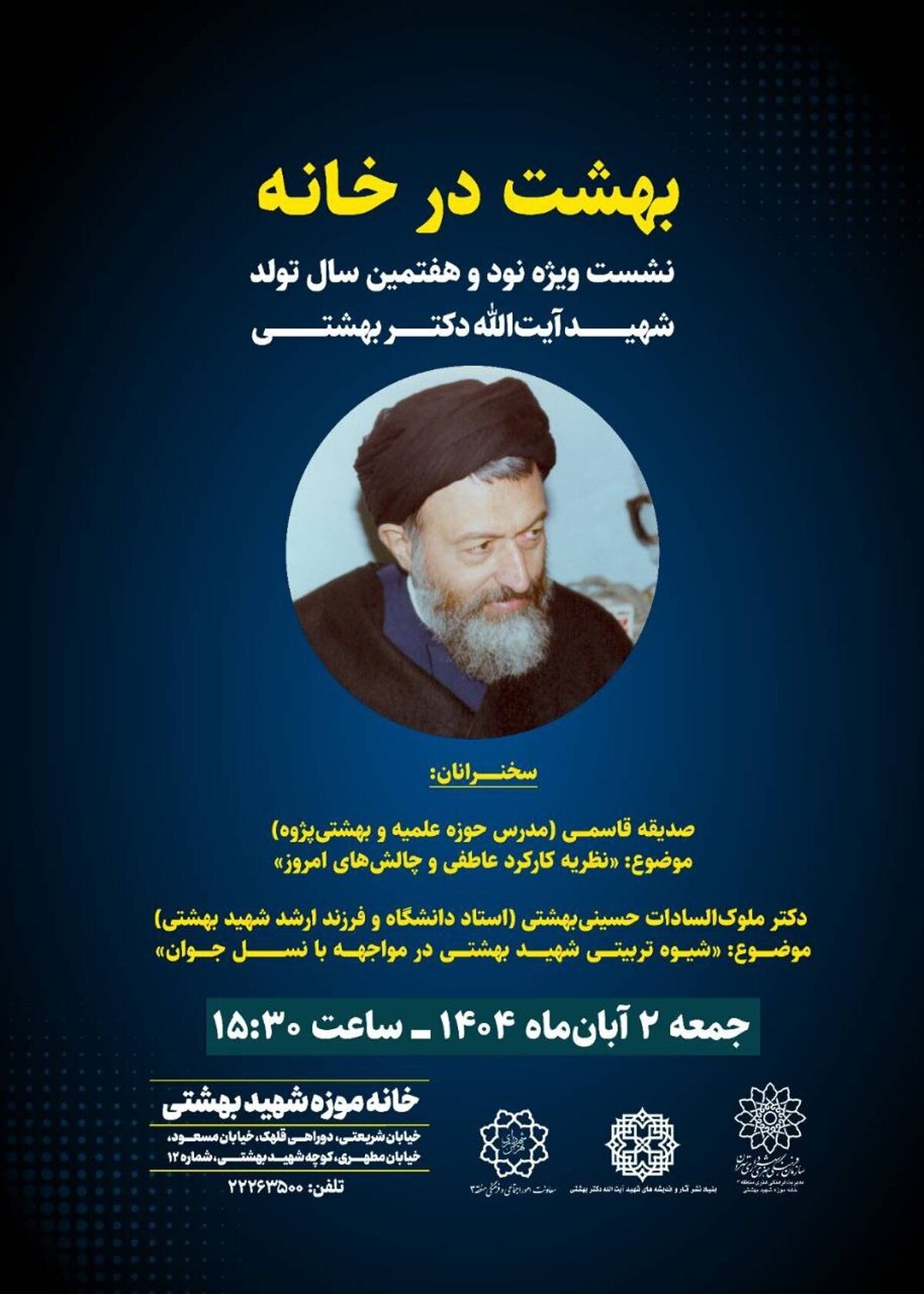 طبق اعلام روابط عمومی مدیریت فرهنگی هنری منطقه ۳؛ به مناسبت گرامیداشت نود و هفتمین سال تولد شهید آیتالله دکتر سیدمحمد حسینی بهشتی، ویژه برنامه «بهشت در خانه» روز جمعه ۲ آبانماه ساعت ۱۵:۳۰ در خانه موزه شهید بهشتی از مراکز فرهنگی هنری منطقه سه برگزار میشود.