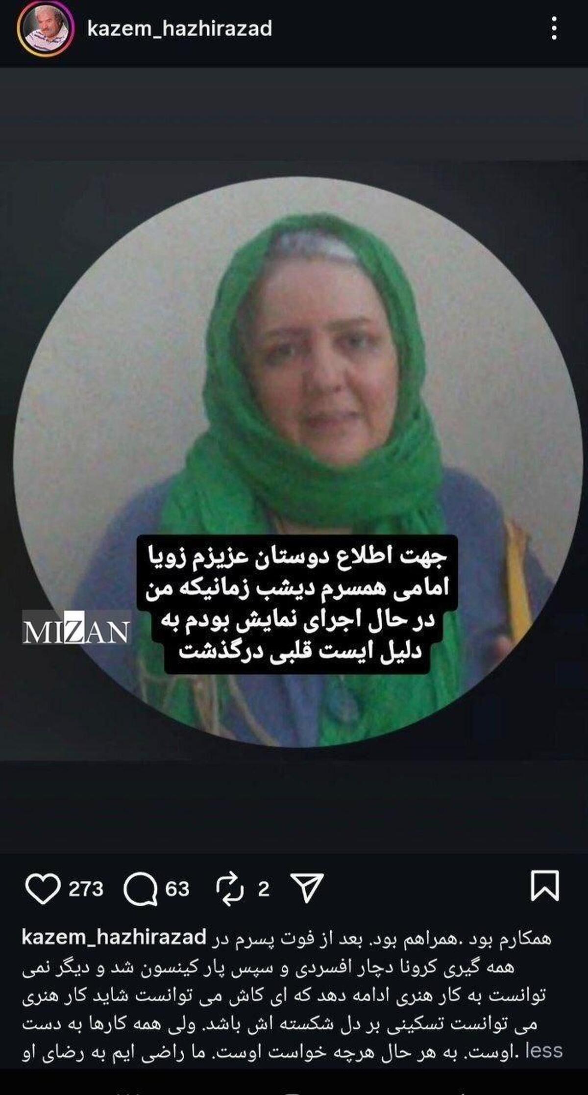 کاظم هژیر آزاد، بازیگر و همسر زویا امامی، بازیگر سینما و تلویزیون خبر درگذشت او را اعلام کرده و نوشته است: زویا امامی، همسرم دیشب زمانیکه من در حال اجرای نمایش بودم، به علت ایست قلبی درگذشت.