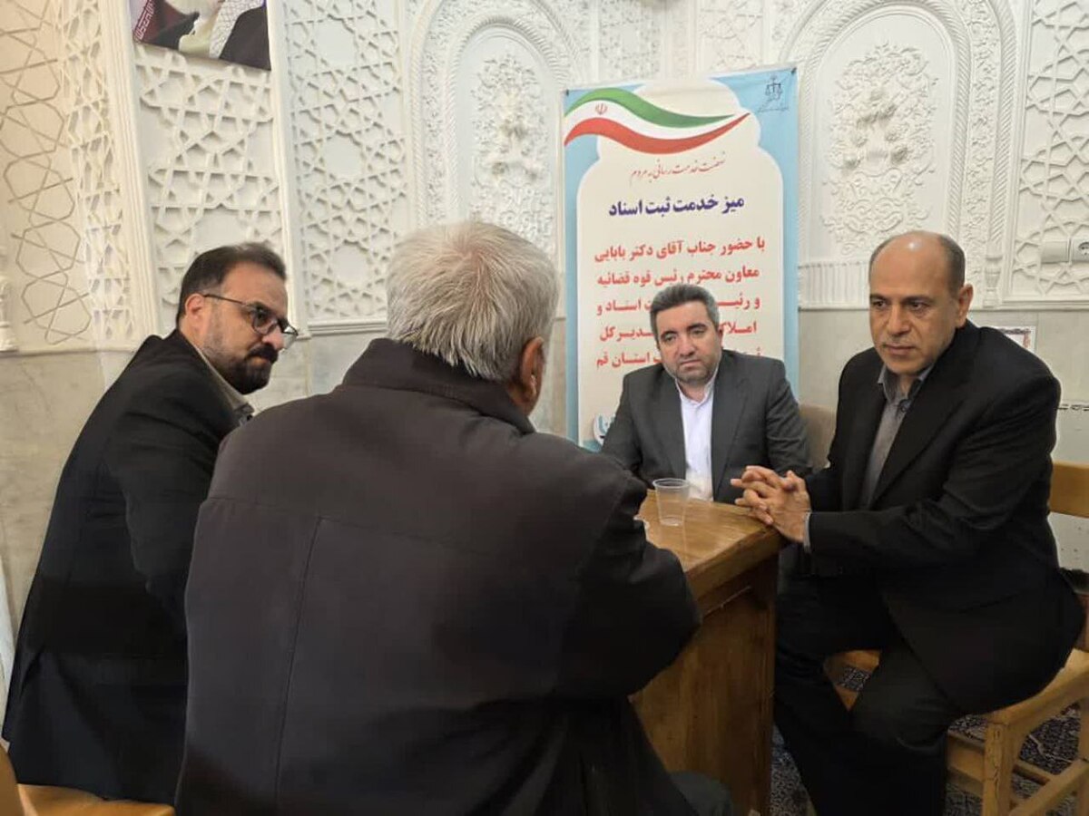 همزمان با سفر حجتالاسلام والمسلمین غلامحسین محسنی اژهای، رئیس قوه قضاییه، به استان قم، بیست و هشتمین میز خدمت ثبتی سازمان ثبت اسناد و املاک کشور توسط حسن بابایی، در صحن مطهر حضرت فاطمه معصومه (س) برگزار شد.