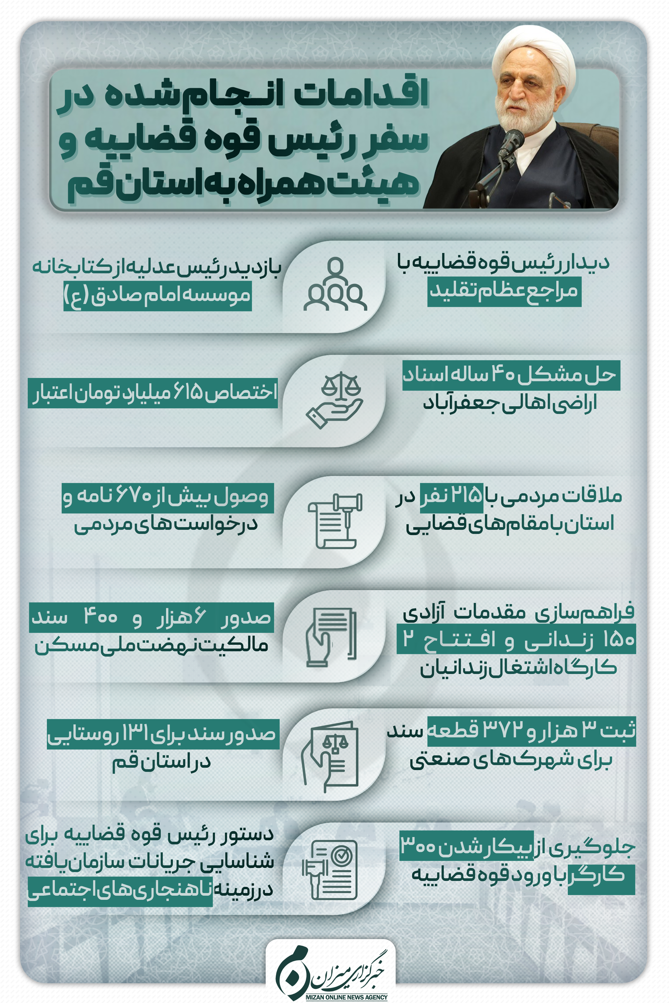 اینفوگرافیک |اقدامات انجام‌شده در سفر رئیس قوه قضاییه و هیئت همراه به استان قم
