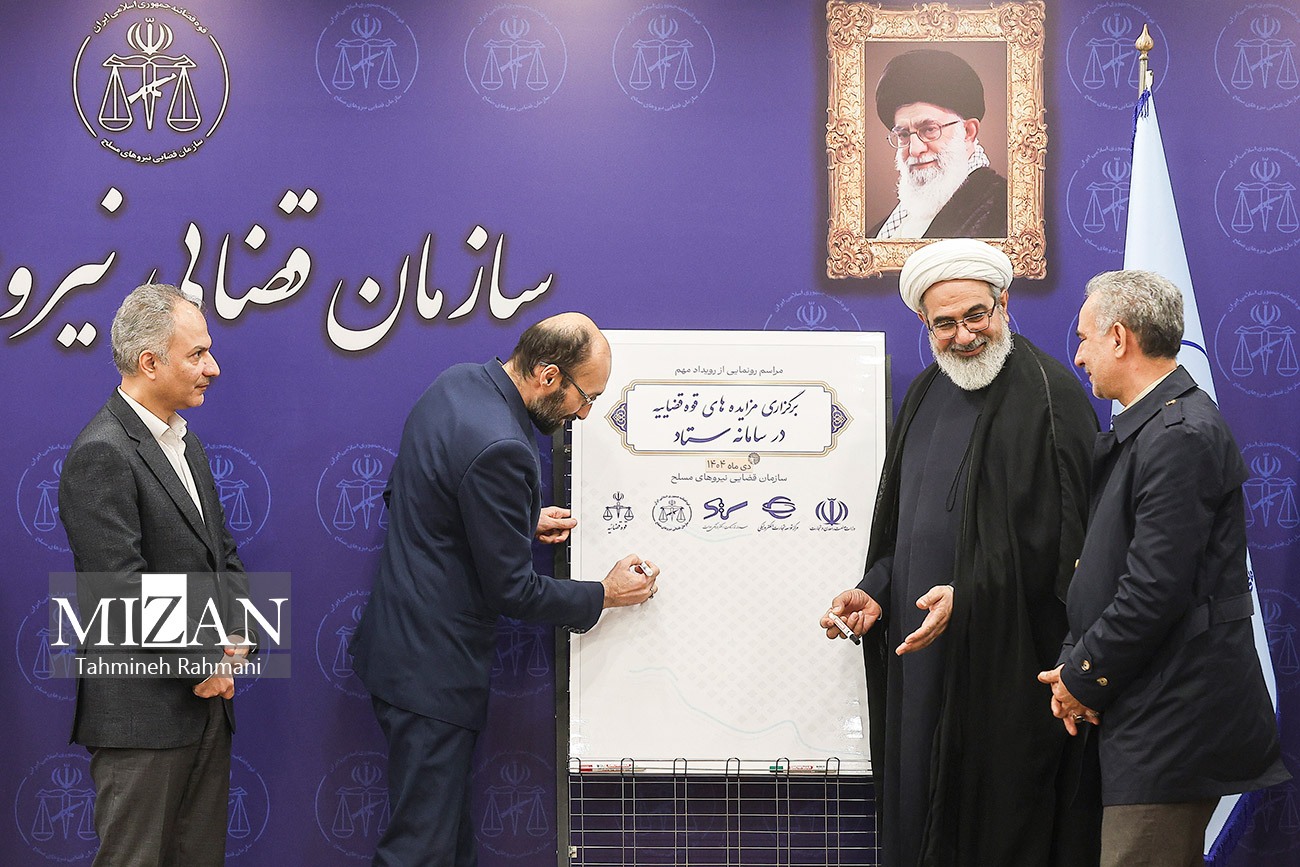 مراسم رونمایی از سامانه برگزاری مزایده‌های الکترونیک قوه قضاییه (ستاد) با حضور حجت‌الاسلام والمسلمین پورخاقان رئیس سازمان قضایی نیرو‌های مسلح، صاحبکار خراسانی معاون راهبردی قوه قضاییه، برگزار شد.