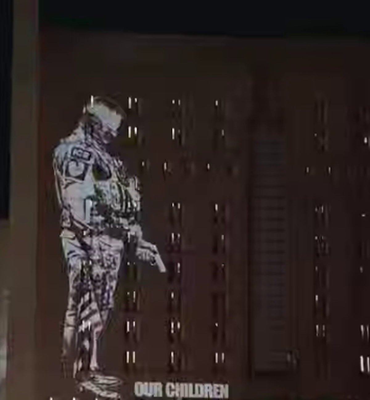 این نمایش در پیامی نمادین، یک مأمور اداره مهاجرت و گمرک را در حال تیراندازی به سوی بشریت، دموکراسی، حقوق و آزادیها به تصویر کشید.