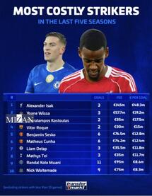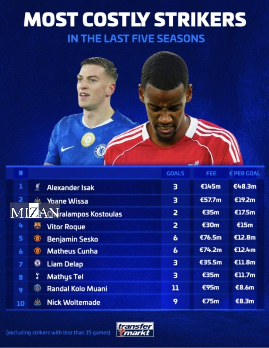 در صدر این فهرست، الکساندر ایساک، مهاجم سوئدی لیورپول قرار دارد. این بازیکن که با مشکل آمادگی جسمانی و مصدومیت به آنفیلد آمده پس از شانزده بازی تنها موفق به زدن سه گل شده و با توجه به مبلغ انتقال ۱۴۵ میلیون یورو، هر گل او چهل و هشت میلیون و سیصد هزار یورو برای باشگاه هزینه داشته است. این رقم رکوردی بیسابقه است و ایساک با فاصله از دیگر مهاجمان، عنوان گرانترین مهاجم ناکام جهان در پنج سال اخیر را از آن خود کرده است.