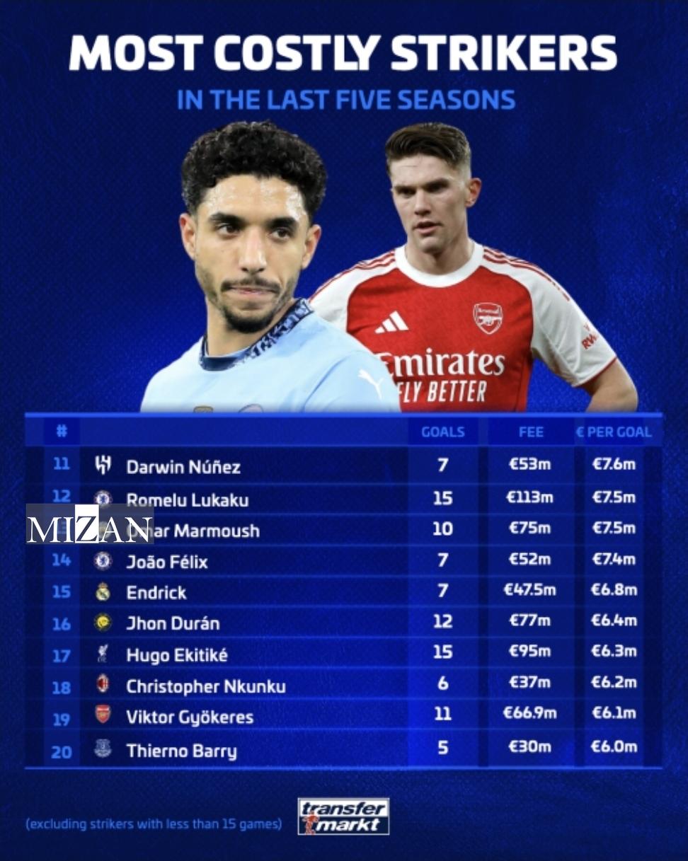 در میان مهاجمان سابق چلسی، ژائو فلیکس و روملو لوکاکو نیز عملکرد قابل توجهی نداشتند و هزینه هر گل آنها به ترتیب هفت میلیون و چهارصد هزار یورو و هفت میلیون و پانصد هزار یورو برآورد شده است. عمر مرموش، بازیکن منچسترسیتی و داروین نونیز مهاجم سابق لیورپول نیز در این بخش قرار دارند و با توجه به عملکرد نهچندان درخشان باشگاههایشان سرمایه زیادی برای هر گل هزینه کردهاند.