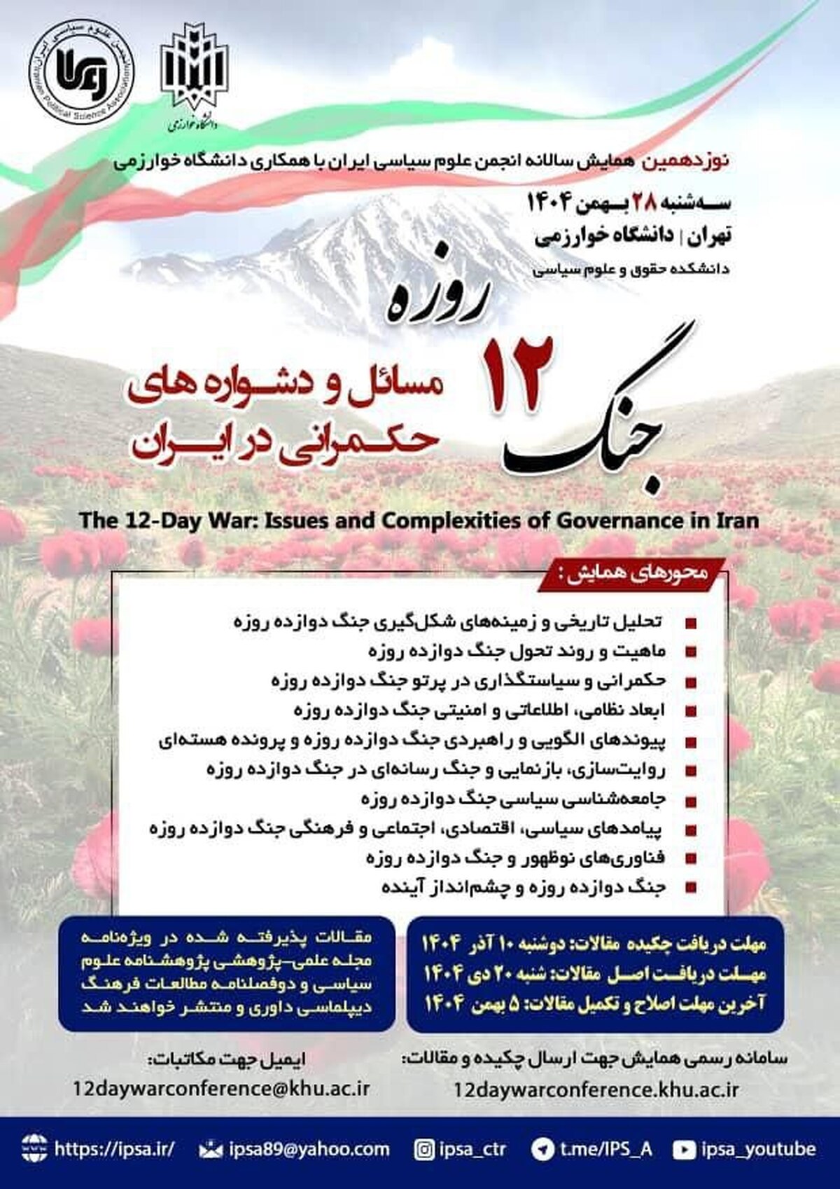 نوزدهمین همایش سالانه انجمن علوم سیاسی ایران، سهشنبه، ۲۸ بهمنماه ۱۴۰۴ با هدف واکاوی ابعاد پنهان و پیچیده «جنگ دوازده روزه» و پیامدهای سیاسی، نظامی، اطلاعاتی، اقتصادی و اجتماعی آن در دانشکده حقوق و علوم سیاسی دانشگاه خوارزمی برگزار میشود.